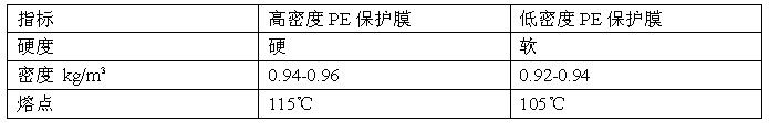 聚乙烯有許多種類,熔點(diǎn)、密度各有不同,高密度PE保護(hù)膜和低高密度PE保護(hù)膜比較可以通過表格來看到: